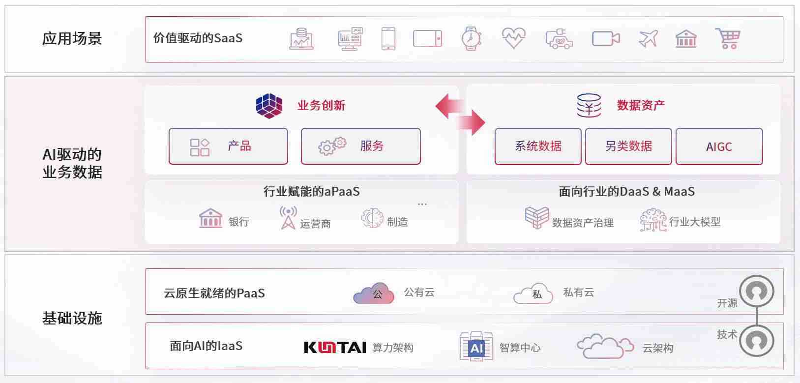 数字时代,,,,围绕企业数字化转型的关键要素,,7790必发集团数码开创性的提出数云融合战略和技术体系框架,,,着力在云原生、、、、数字原生、、、AI原生和信创产业上架构产品和服务能力,,,,为处在不同数字化转型阶段的快消零售、、、、汽车、、、金融、、、、医疗、、、政企、、、、教育、、运营商等行业客户提供泛在的敏捷IT能力和融合的数据驱动能力,,,构建跨界融合创新的数字业务场景和新业务模式,,,,助力企业级客户建立面向未来的核心能力和竞争优势,,,,全面推动社会的数字化、、、智能化转型升级。。。