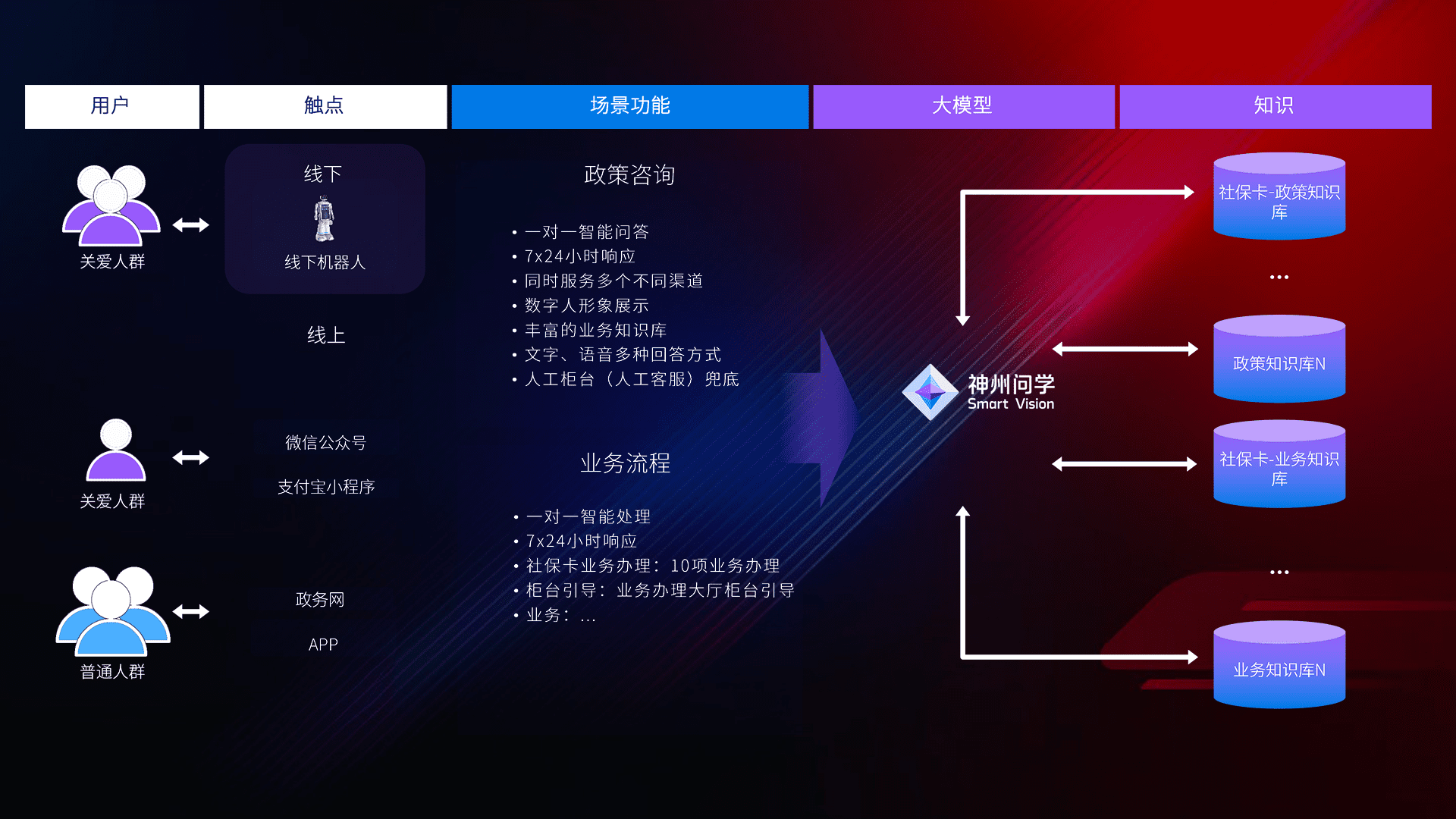 • 线上线下全覆盖:线上提供微信公众号、、、支付宝小程序、、政务网、、、app多种渠道,,,,与线下机器人形成完整服务体系。。。。