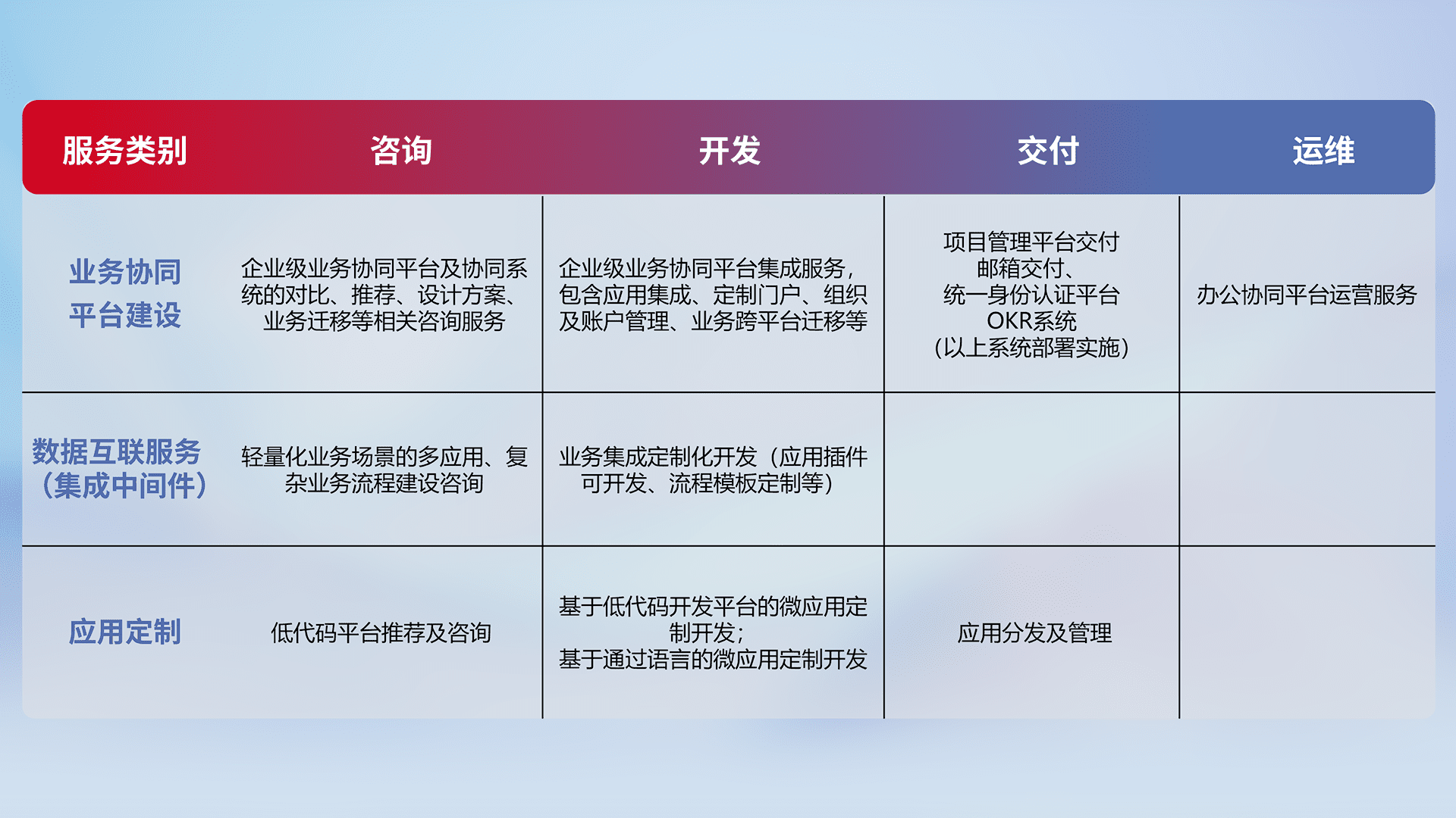 针对钉钉、、企微、、、、IDaas等平台级产品提供产品的规划、、、、方案、、、交付、、、定制化开发等服务,,实现如统一协同办公、、智能客户服务、、、、混合会议管理、、、智能数据查询、、、等业务场景,,实现数字化转型。。