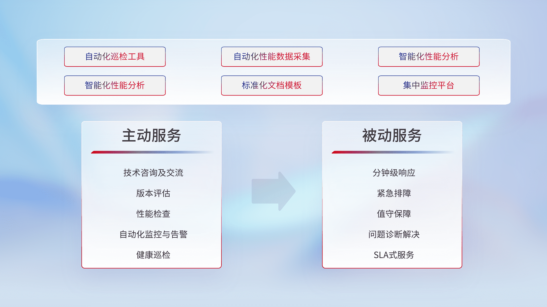 智能化工具和标准化文档,,,保障服务质量,,,,提供主动服务(包含技术咨询、、、版本评估、、、性能检查、、、、自动化监控与告警、、、、健康巡检)和被动服务包含(分钟级响应、、、紧急排障、、、、值守保障、、、问题诊断解决、、SLA服务)。。