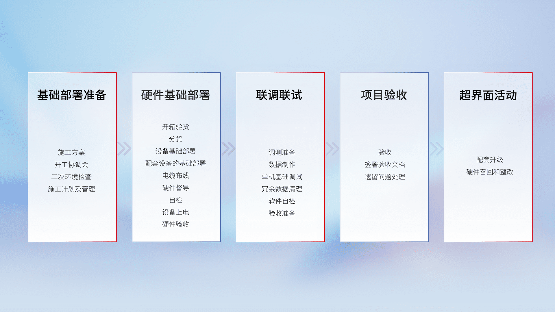 从基础部署准备、、硬件基础部署、、联调联试、、、、项目验收、、越界面活动的全过程可追溯,,,,保证施工质量和进度。。。。